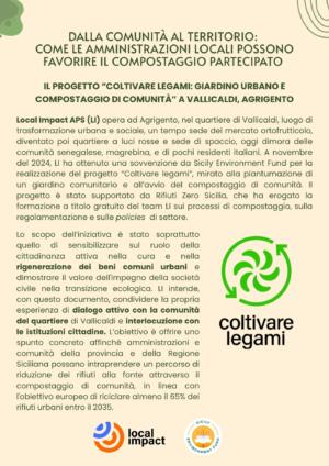 Per rendere queste esperienze sempre più accessibili e diffuse, abbiamo elaborato un report destinato all’Amministrazione comunale di Agrigento, con proposte concrete per facilitare e sostenere iniziative di compostaggio di comunità e gestione partecipata degli spazi verdi, in primis l'approvazione del regolamento comunale sul compostaggio, come indicato dalla Regione Siciliana.