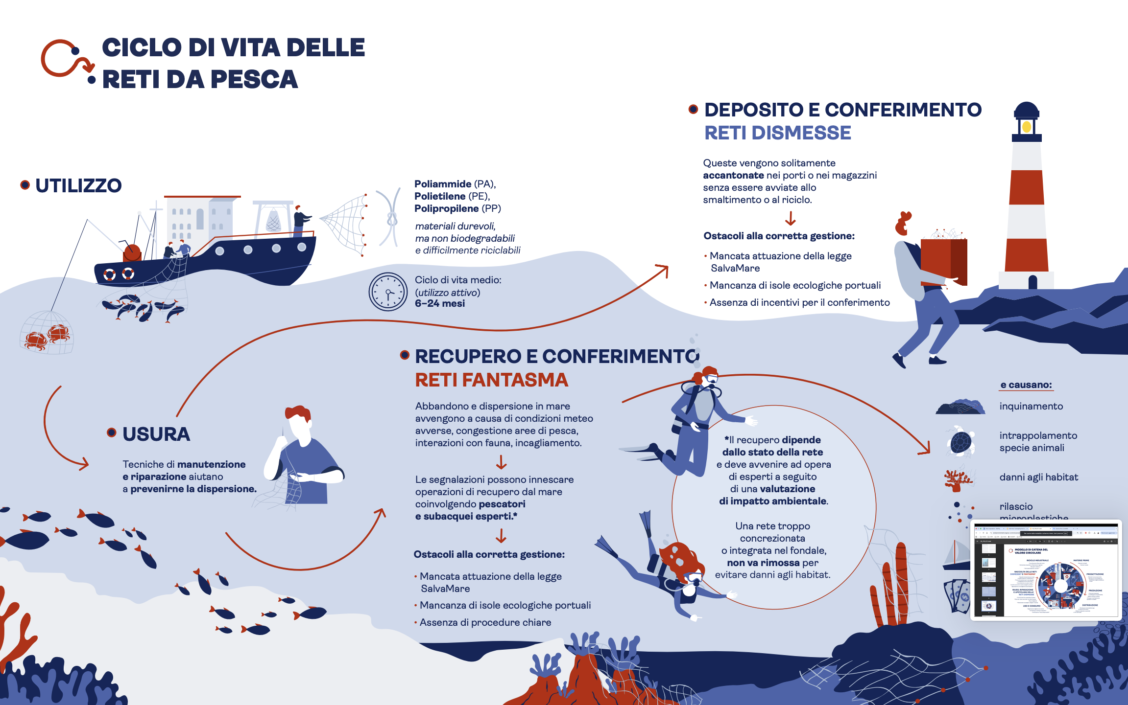 Scarica il Policy brief con i principali risultati e le raccomandazioni formulate nell’ambito del progetto "Liberare il mare", elaborato a seguito di consultazioni con una rete regionale di stakeholder, ricercatori e organizzazioni. Il documento analizza il ciclo di vita delle reti da pesca, individuando le criticità e gli ostacoli per una loro corretta gestione, le opportunità per prevenirne l'abbandono e le soluzioni per promuovere un approccio di economia circolare.